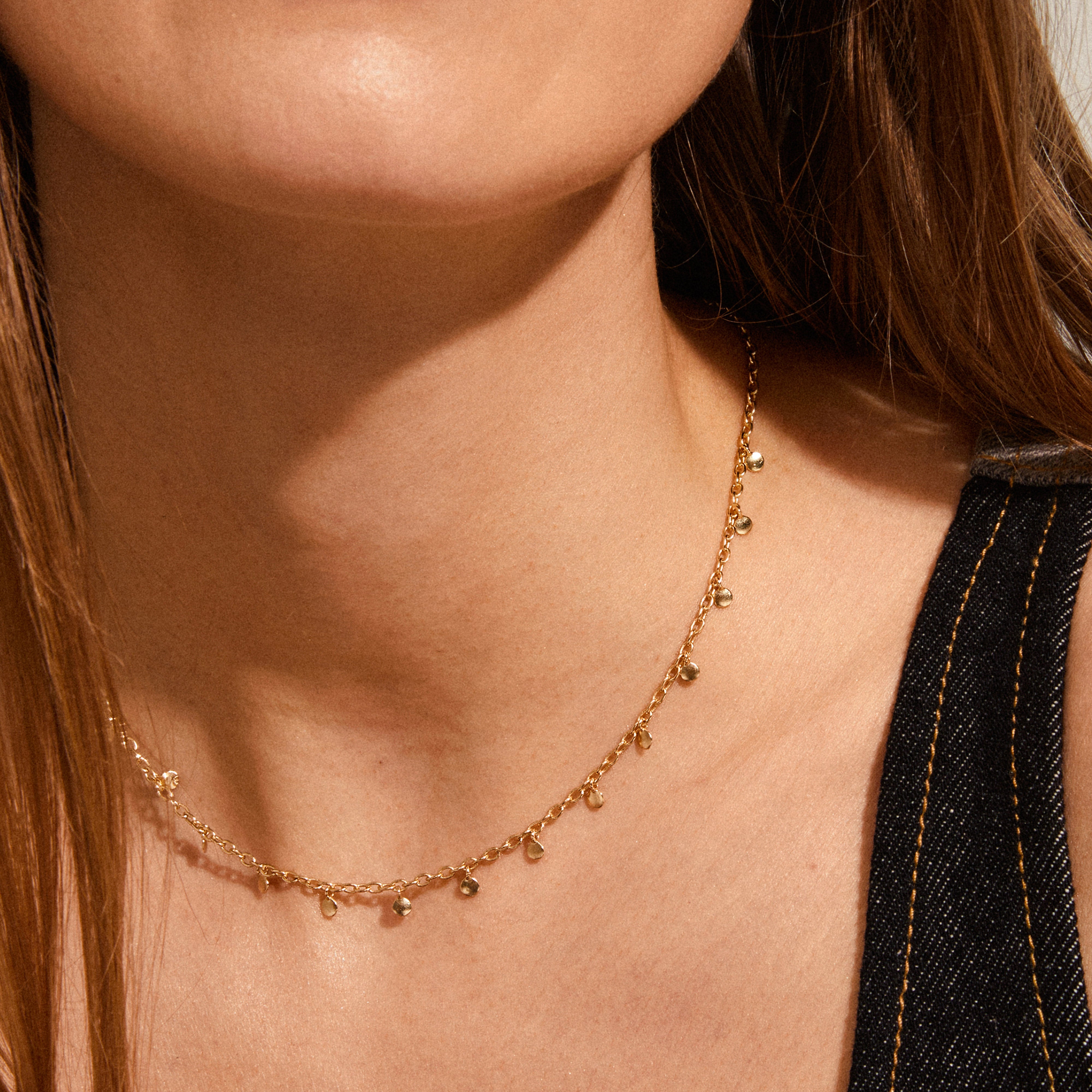 Boho vibes! Guldbelagt halskæde med små, blanke discs, der danser langs kæden og fanger lyset. Et delikat design med et strejf af boho luxury og dreamy wanderlust, perfekt til både en loose skjorte eller et flowy dress. Halskæden er 40 cm + 9 cm forlængerkæde og fremstillet af 99% genanvendt materiale – fordi de små ting gør en forskel.
