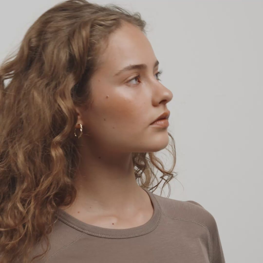 Dreh den Style auf! Vergoldete NAJA Hoops im angesagten Twist-Design bringen frischen Wind in das klassische Half-Hoop-Game. Die gedrehten Details fangen das Licht ein und sorgen für einen stylischen Vibe voller Energie – perfekt für jeden Tag oder entspannte Cozy-Momente. Kombiniere sie zum Beispiel mit einem chunky Strickpulli für einen lässigen, aber absolut on-point Look. Diese Hoops werden garantiert zu deinem neuen Lieblings-Piece, versprochen! Gefertigt aus 98% recyceltem Material – weil jedes Detail zählt.