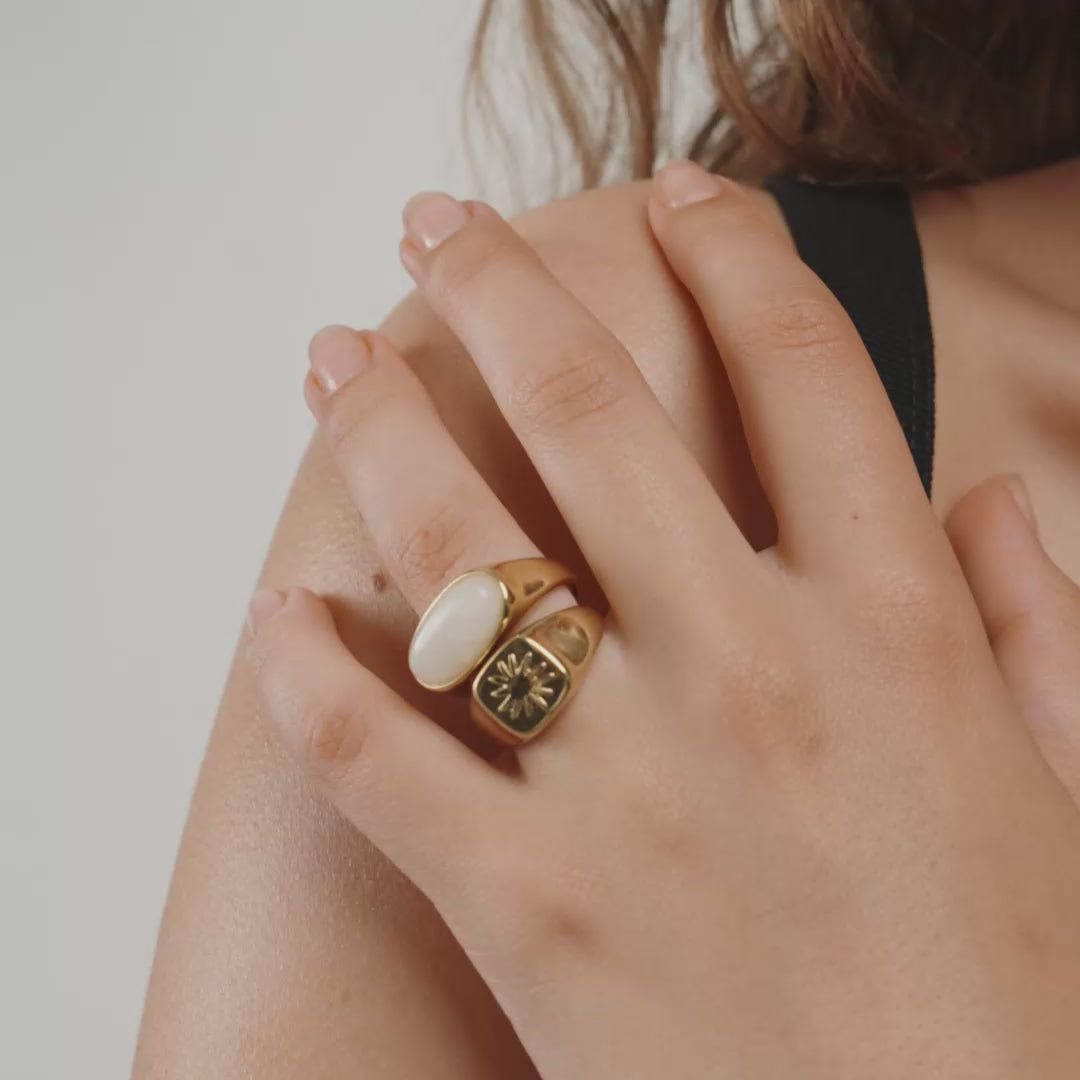 Double up on style! The PRISM rings from Pilgrim come as a set of two silver-plated signet designs, giving you endless ways to mix and match your look. One ring features an oval White Jade semi-precious stone for that soft, dreamy vibe, while the other is embossed with a sun motif for a cool, handcrafted feel. Both rings are adjustable in size for the perfect fit—wear them solo or stack them together to suit your mood. Crafted from durable, water-resistant materials and made with 92% recycled materials—because it’s the little details that make all the difference.