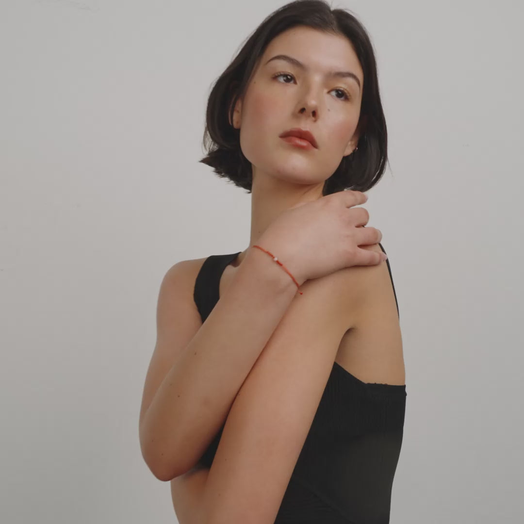 A piece just for you! An ultra-delicate bracelet crafted from red cotton cord with an adjustable knot closure for ease of wear. This handcrafted bracelet includes a small Moonstone, the birthstone for June. Moonstone symbolises intuition and self-discovery, perfect for imbuing your look with an understated personal essence. A beautiful and subtle accessory with a dreamy feel - ideal for those who love a delicate and minimalist lux boho look or as a meaningful gift for a loved one.